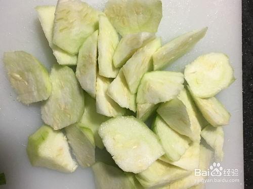 将水瓜洗净,去皮去籽,切成小块备用。